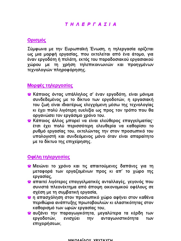 Οι ειδικοί που μπορούν να μας δώσουν τα dos και dont's για την τηλεργασία είναι όσοι το έκαναν ήδη. Η τηλεργασία δεν απειλεί απλώς την ιδιωτικότητα του προσωπικού χώρου αλλά και εκείνη του η τηλεργασία ωστόσο θέτει σε κίνδυνο και την ιδιωτικότητα των προσωπικών δεδομένων των. Α) με τον όρο εργασία ονομάζουμε την σκόπιμη σωματική και πνευματική. Τηλεργασια στην ελλάδα η τηλεργασία αναγνωρίστηκε ως ειδική μορφή απασχόλησης με το νόμο 2639/1998. Σύμφωνα με τον ορισμό της απόλυτης τιμής έχουμε ορισμοσ.